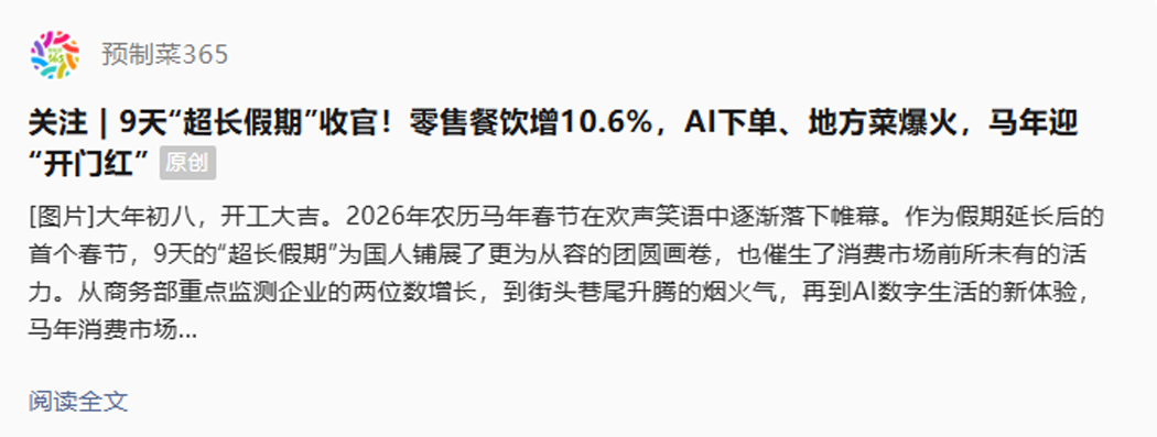 关注 | 9天“超长假期”收官!零售餐饮增10.6%,AI下单、地方菜爆火,马年迎“开门红”